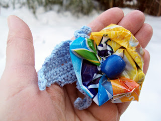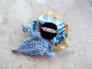 Materiale folosite: eticheta plastic Nestea, fir bumbac, bila de lemn vopsita in albastru, rondea fetru, ac de brosa.