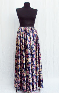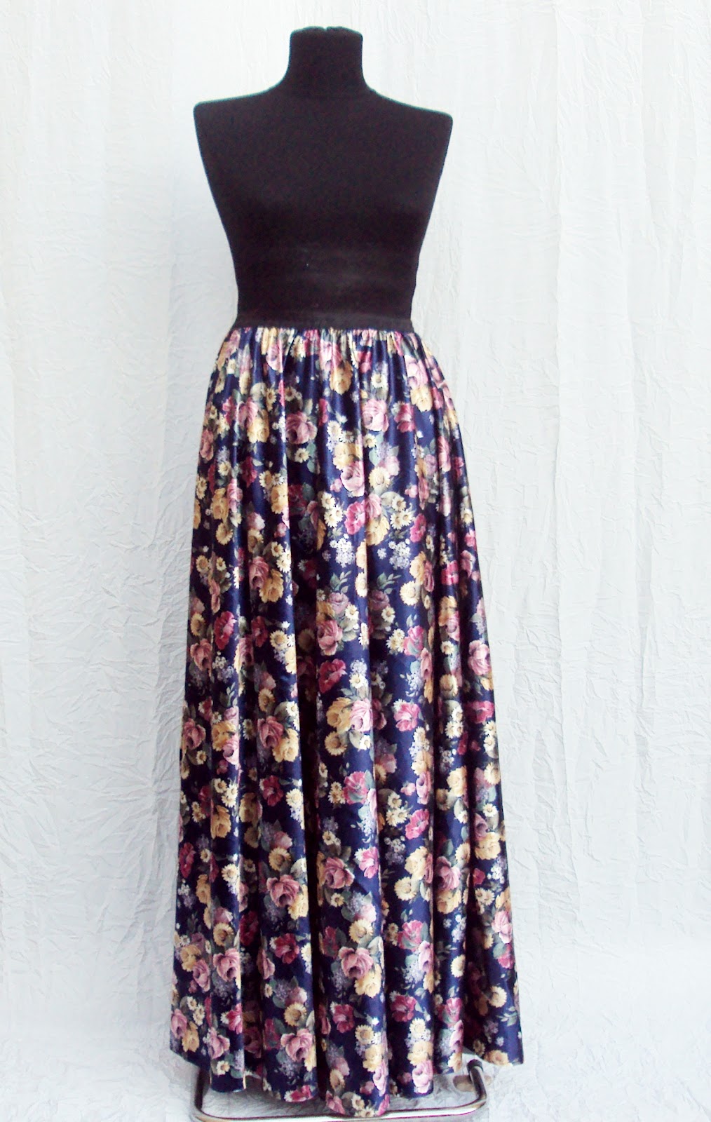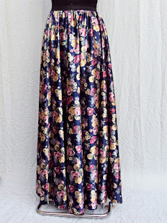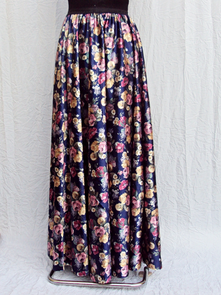 Fusta cloche din material imprimat gen lycra, cu flori colorate pe fond bleumarin.