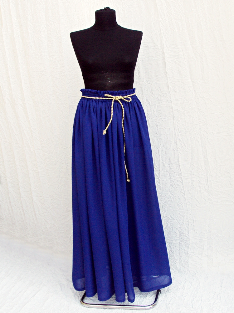 Fusta din voal de culoare albastra, lunga, cu talie inalta, montata pe trei randuri de elastice.