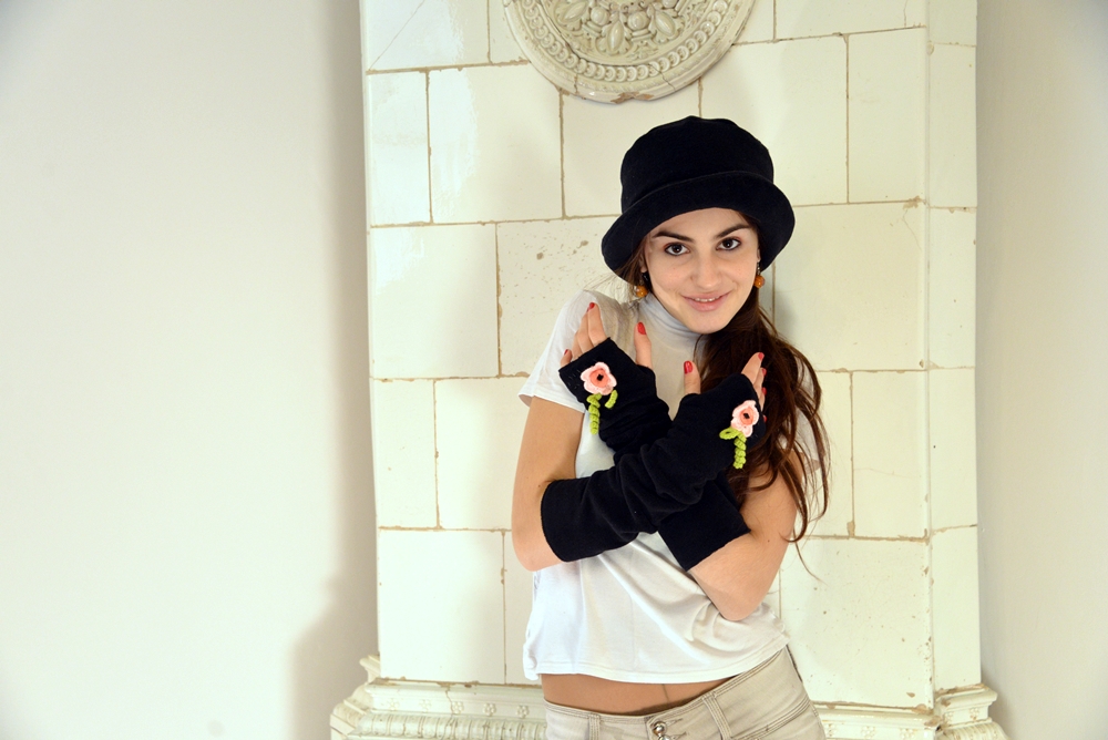 manusi fara degete, din fleece de culoare neagra, cu floricele crosetate.