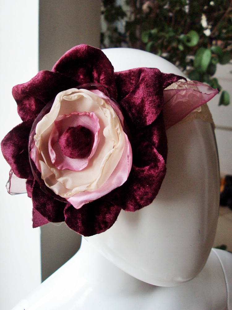 Bentita din dantela elastica cu floare din catifea gena, tafta si organza roz si crem.