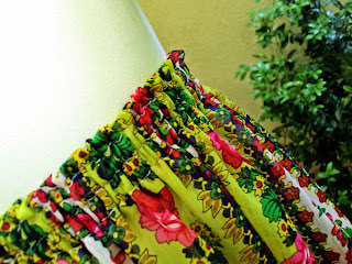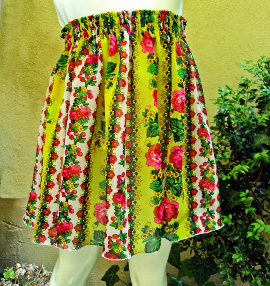 Fustita scurta din voal imprimat cu flori colorate pe fond galben strident, cu aspect gipsy.