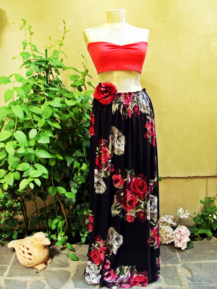 Lycra, imprimat cu tradafiri rosii pe fond negru.