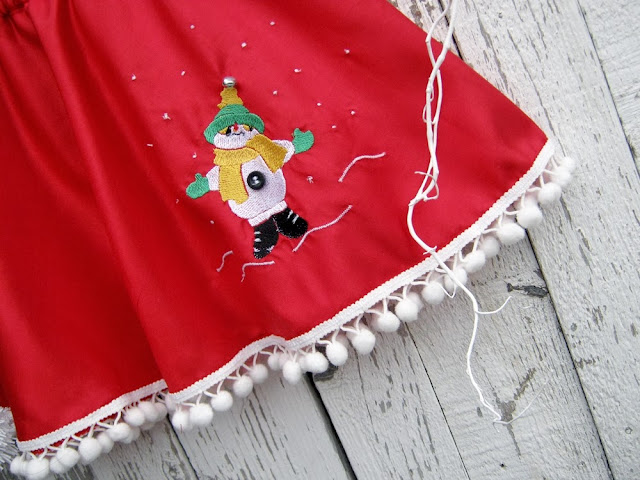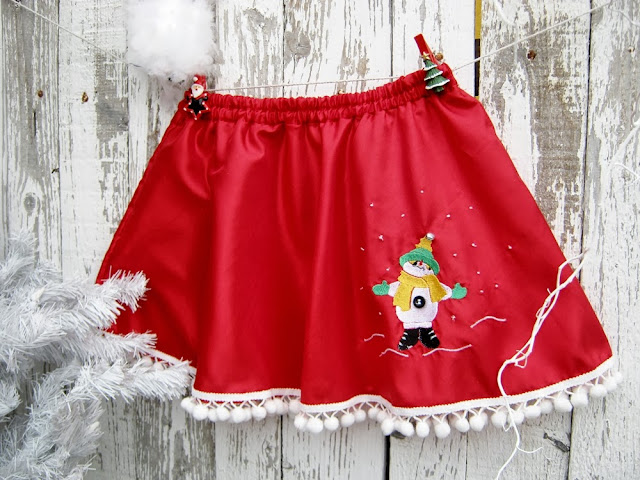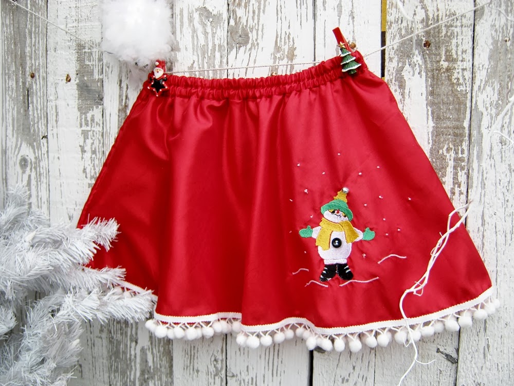 Fustita din tafta rosie cu broderie si ciucurasi, montata pe elastic in talie.