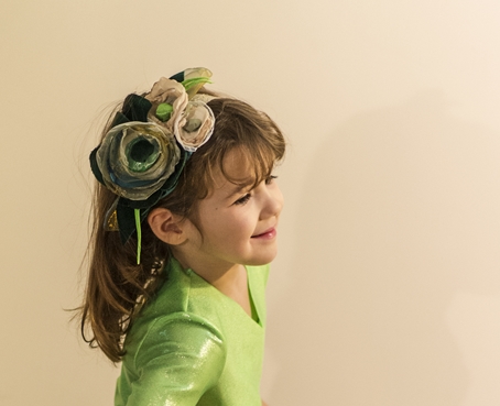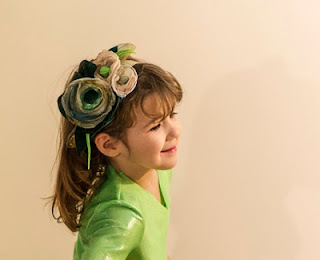 Bentita cu flori din catifea, tafta, satin si organza, in diferite nuante de verde, crem, bej, montate pe dantela elastica de culoare crem.
