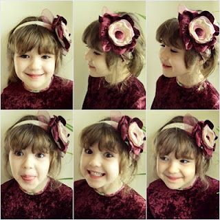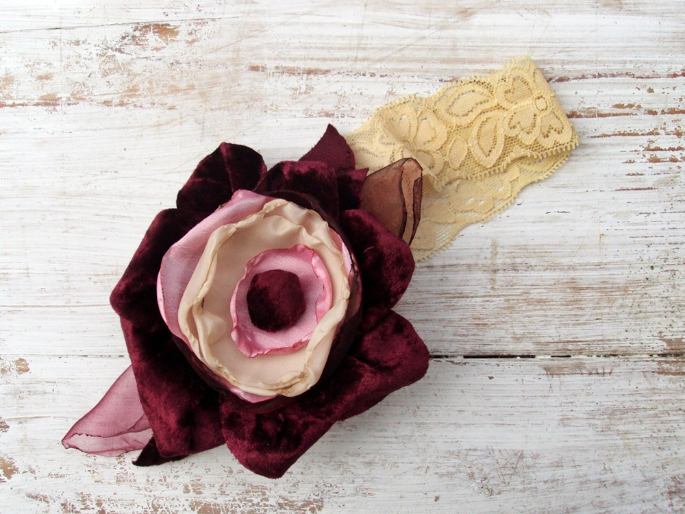 Bentita din dantela elastica cu floare din catifea gena, tafta si organza roz si crem.