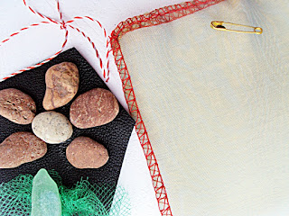 Culese una cate una de pe plaja din Vama Veche, invartite, rasucite, zdranganite, tarate si tocite in valuri milioane de ani la rand, pietricele, cioburi de sticla, bucatele de scoica... lipite pe piele, catifea, organza, satin... cu un strop de tul pentru rafinament, cu un pic de vopsea aurie pentru eleganta... si cu ac de brosa pe dos pentru a fi practice si purtabile in toate anotimpurile... aducand cu ele lumina de soare, zgomot de mare si caldura de vara...