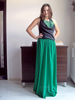 Fusta din tricot verde, montata pe elastic negru lat.