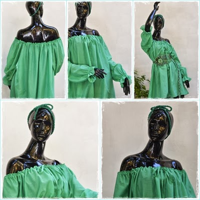 La decolteu este incretita pe snur prevazut cu capete-floare. Manecile sunt usor incretite si au volan.Poate fi purtata liber sau legata lejer in talie.