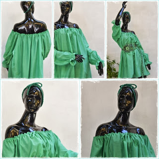 La decolteu este incretita pe snur prevazut cu capete-floare. Manecile sunt usor incretite si au volan.
